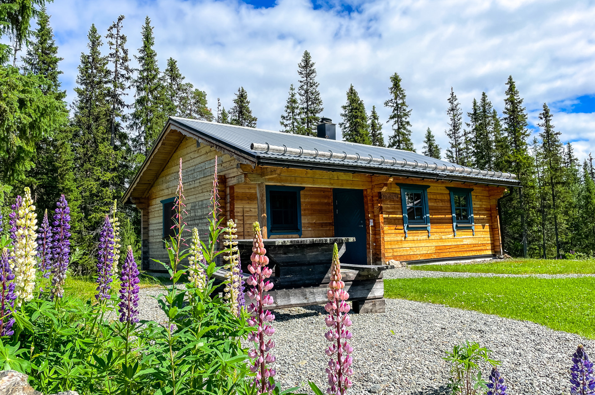 Lupinerna blommar så vackert framför timmerstugan Balder