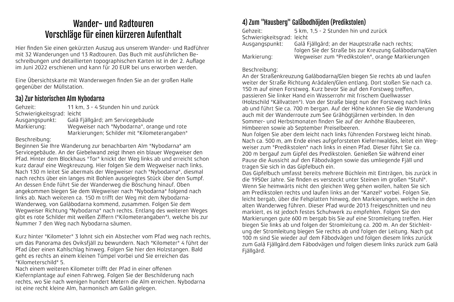 Wir sind selbst wander- und naturbegeistert, viel draußen unterwegs und haben uns auch der Pflege von einigen Wanderwegen in der direkten Umgebung angenommen. Diese und viele weitere Touren haben wir in fast 30- jähriger Recherche-Arbeit in unserem Wanderführer als Buch beschrieben. Für einen kurzen Aufenthalt, wie z.B. als Campinggast, bekommt jeder Gast, egal ob in einem Ferienhaus, in der Ferienwohnung oder als Campinggast eine Broschüre mit Wandervorschlägen und Beschreibungen der beliebtesten Touren bei uns auf dem Galå Fjällgård.